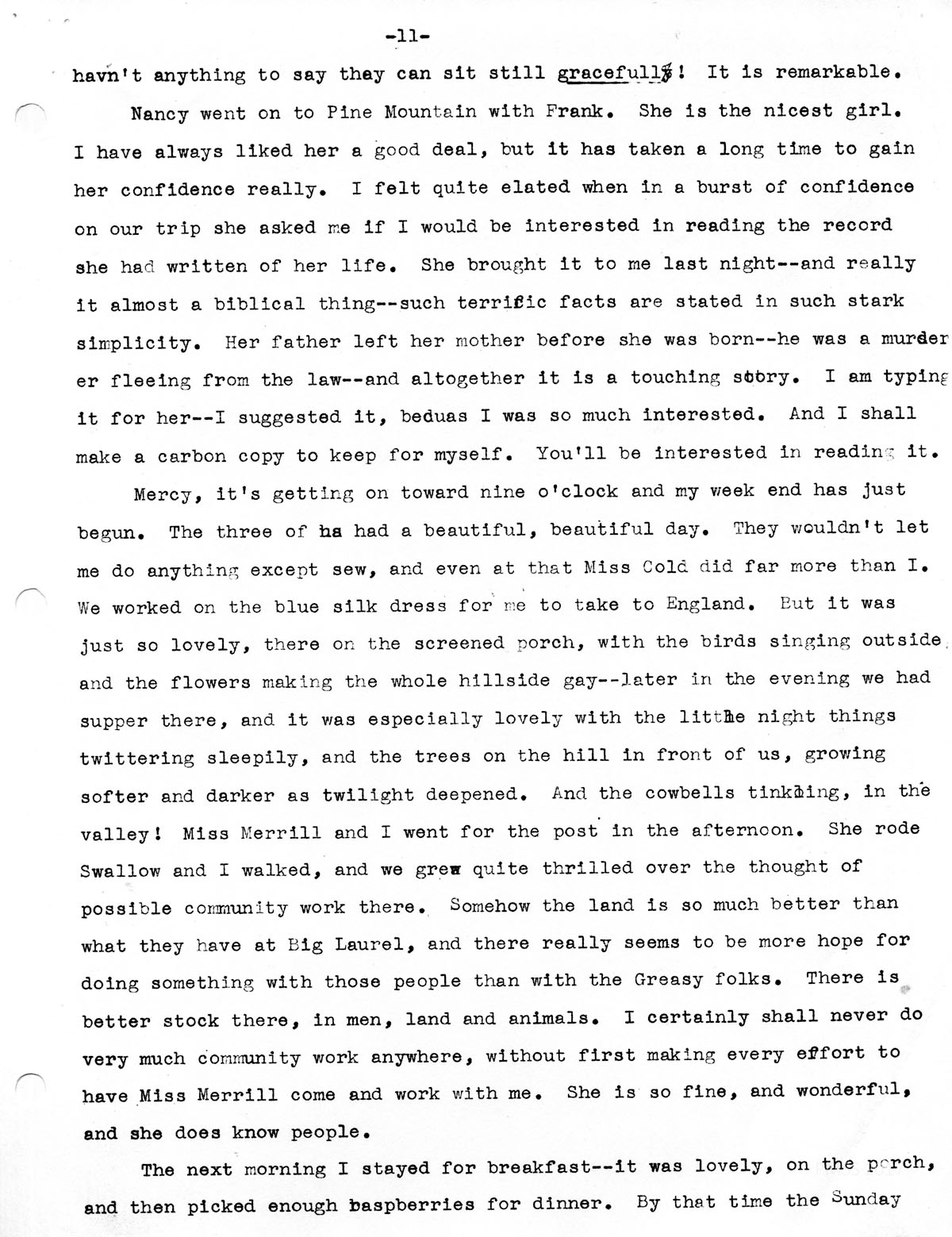 Nancy [Nancy Jude] went on to Pine Mountain with Frank. She is the nicest girl. I have always liked her a good deal, but it has taken a long time to gain her confidence really. I felt quite elated when in a burst of confidence on our trip she asked me if I would be interested in reading the record she had written of her life. She brought it to me last night — and really it almost a biblical thing — such terrific facts are stated in such stark simplicity. Her father left her mother before she was born — he was a murderer fleeing from the law — and altogether it is a touching story. I am typing it for her — I suggested it, because I was so much interested. And I shall make a carbon copy to keep for myself. You’ll be interested in reading it.