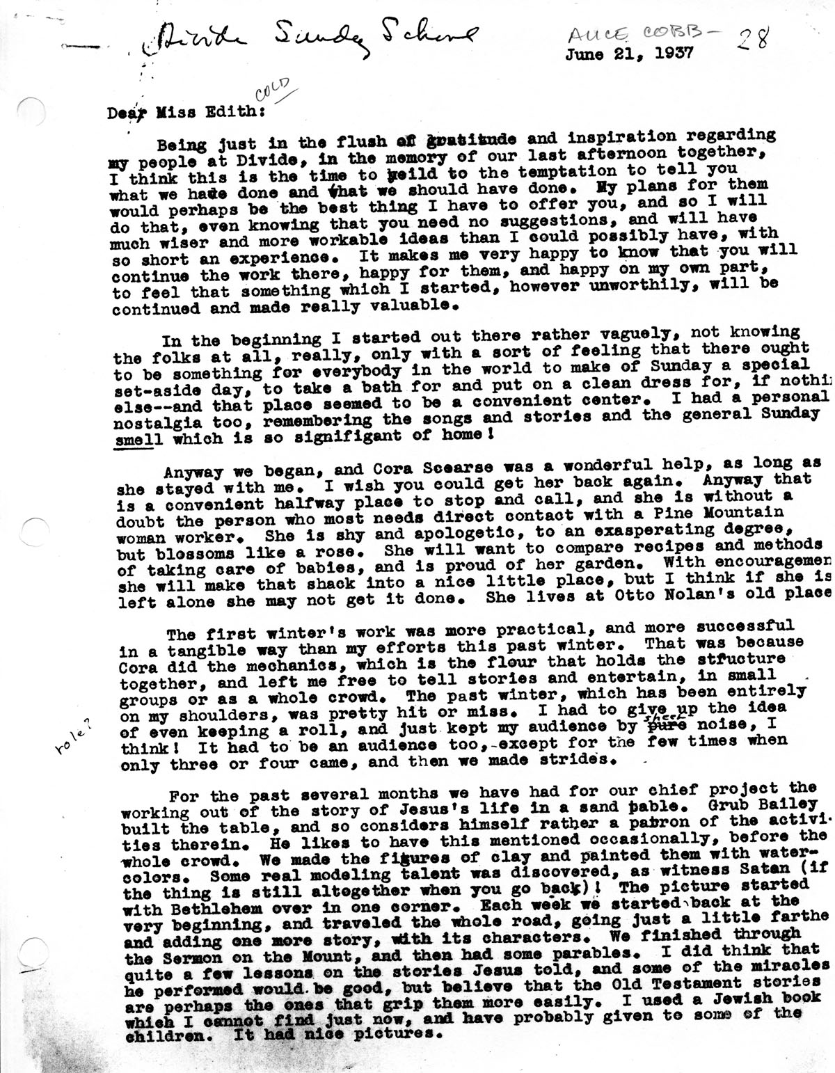 TAGS: Alice Cobb Stories Handing Over Divide Sunday School to Miss Cold, June 1937; Alice Cobb; Divide, KY; Divide Sunday School; Edith Cold; Pine Mountain Settlement School; Harlan County, KY; Sunday schools; religion; education; church; community; Bible Institute; handwork; songbooks; birthdays; library;