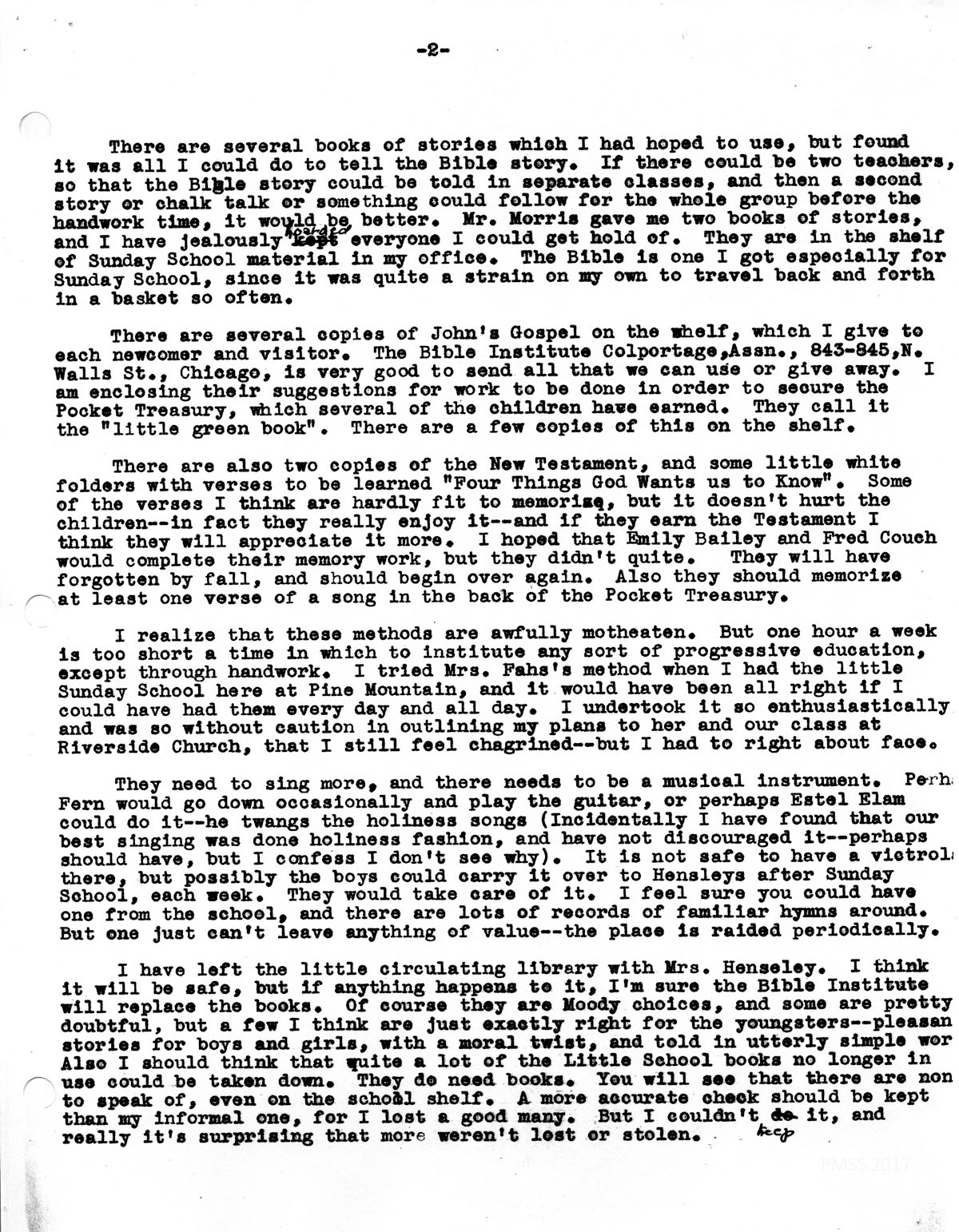 There are several copies of John’s Gospel on the shelf, which I give to each newcomer and visitor. The Bible Institute Colportage Assn., 843-845, N. Walls St., Chicago, is very good to send all that we can use or give away. I am enclosing their suggestions for work to be done in order to secure the Pocket Treasury, which several of the children have earned. They call it