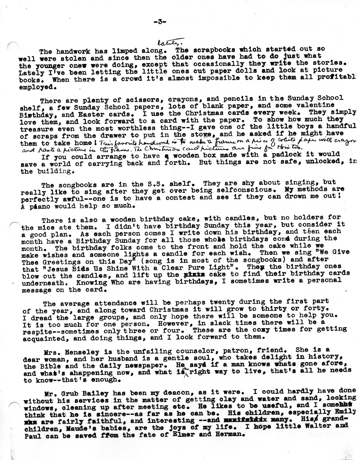[Notation; “Lately,”] The handwork has limped along. The scrapbooks which started out so well were stolen and since then the older ones have had to do just what the younger ones were doing, except that occasionally they write the stories. Lately, I’ve been letting the little ones cut paper dolls and look at picture books. When there is a crowd it’s almost impossible to keep them all profitably employed.