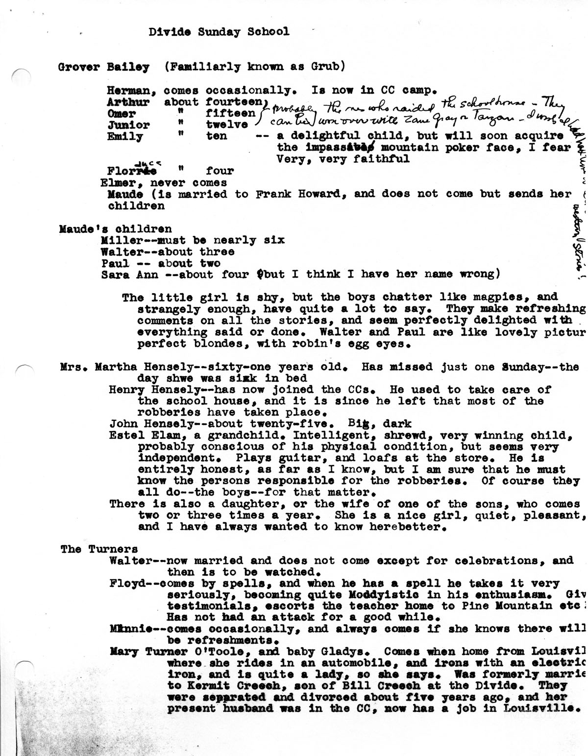 They need to sing more and there needs to be a musical instrument. Perhaps Fern [Fern Hall Hayes] would go down occasionally and play the guitar, or perhaps Estel Elam could do It—he twangs the holiness songs (Incidentally I have found that our best singing was done holiness fashion, and have not discouraged it—perhaps should have, but I confess that I don’t see why) It is not safe to have a victrola there, but possibly the boys could carry it over to Hensley after Sunday School, each week. They would take care of It. I feel sure you could have one from the school, and there are lots of records of familiar hymns around. But one Just can’t leave anything of value—the place is raided periodically.