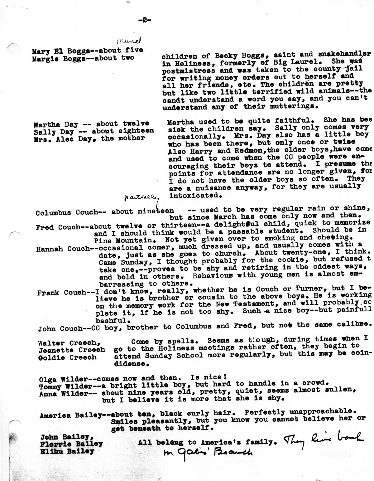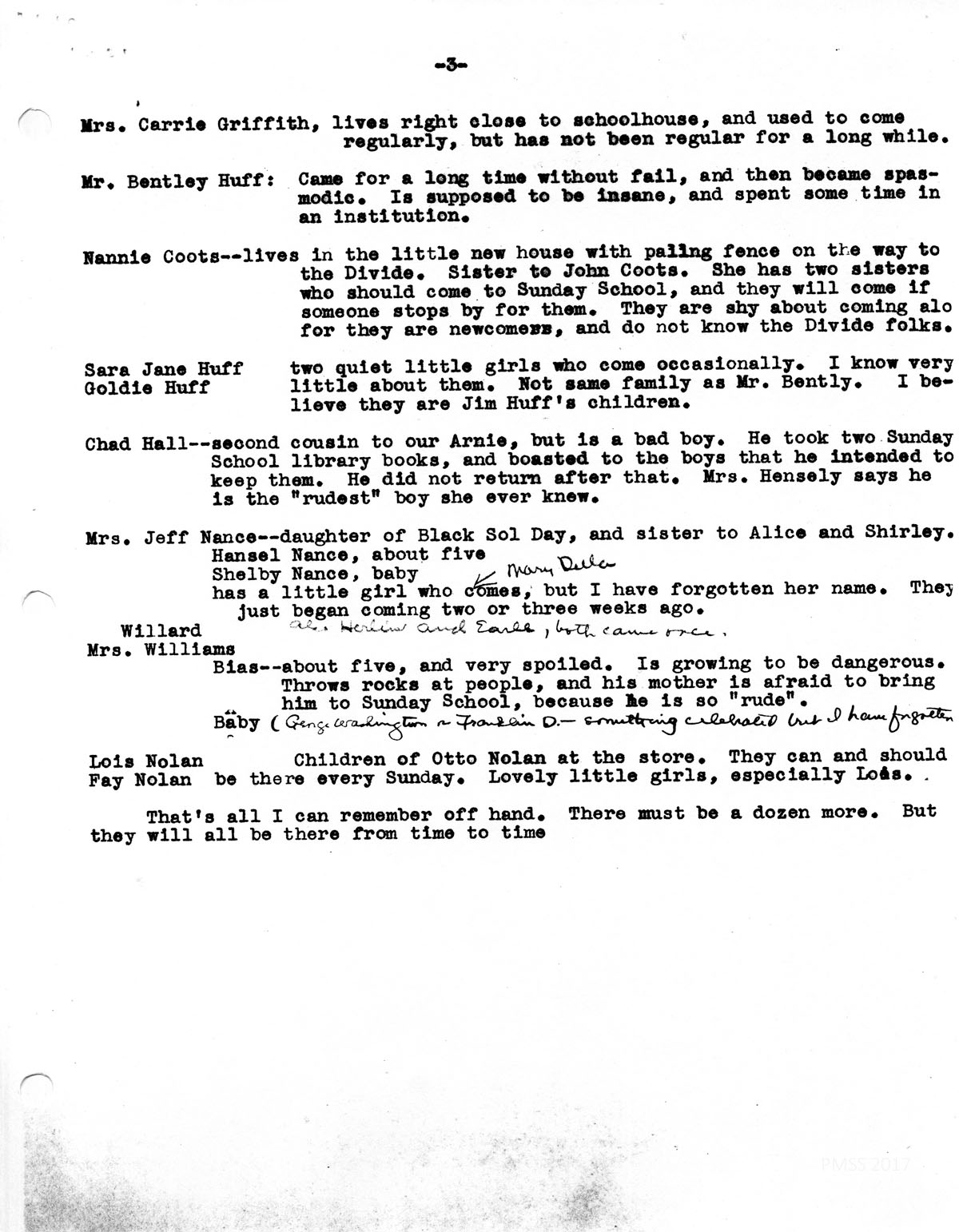 Biss Williams — about five and very spoiled. I growing to be dangerous. Throws rocks at people, and his mother is afraid to bring him to Sunday School, because he is so “rude.”