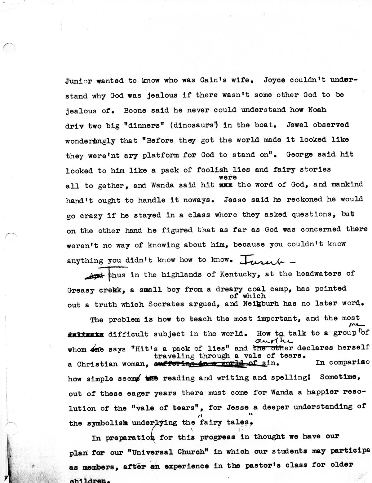 The problem is how to teach the most important and the most difficult subject in the world. How to talk to a group, one of whom says “Hit’s a pack of lies,” and the other declares herself a Christian woman, “traveling through a vale of tears.” In comparison how simple seems reading and writing and spelling! Sometime, out of these eager years, there must come for Wanda a happier resolution of the ‘vale of tears,’ for Jesse a deeper understanding of the symbolism underlying the ‘fairy tales.