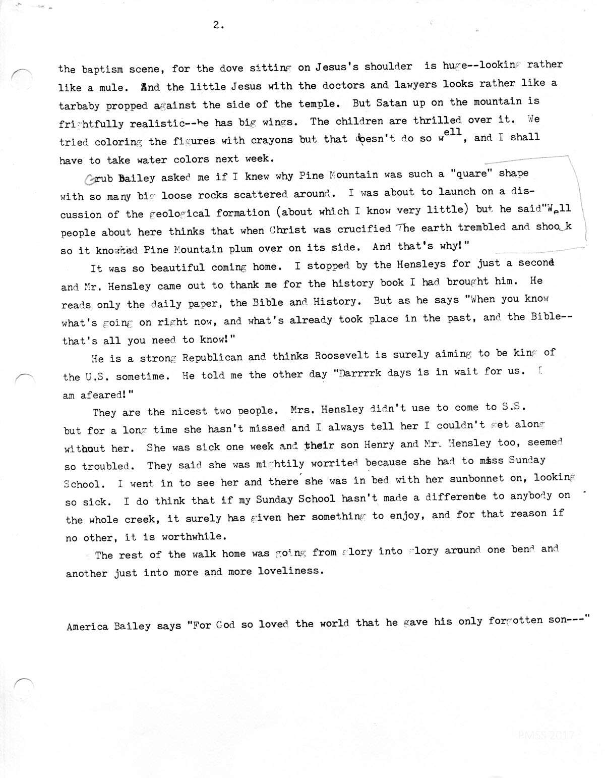 TAGS: Alice Cobb Stories Sunday School at Divide, April 25, 1937; Alice Cobb; Divide, KY; 1937; stories; religion; Sunday School; Grub Bailey family; Minnie and Mary Turner; Martha Day; Kermit Creech; Grub Hensley family; Valentine’s Day; education; geology; Franklin D. Roosevelt; Republicans; Democrats; America Bailey; Fred Couch;