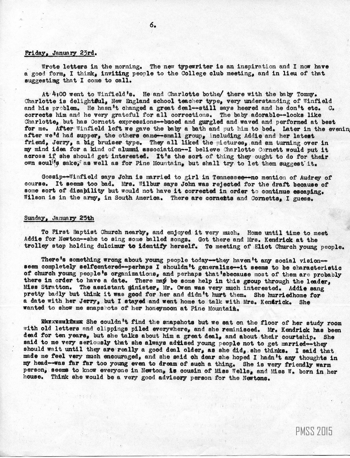 There’s something wrong about young people today — they haven’t any social vision — seem completely self-centered — perhaps I shouldn’t generalize — it seems to be characteristic of church young people’s organizations, and perhaps that’s because most of them are probably there in order to have a date. There may be some help in this group through the leader, Miss Stratton. The assistant minister, Mr. Owen, was very much interested. Addie sang pretty badly but think it was good for her and didn’t hurt them. She hurried home for a date with her Jerry, but I stayed and went home to talk with Mrs. Kendrick. She wanted to show me snapshots of her honeymoon at Pine Mountain.