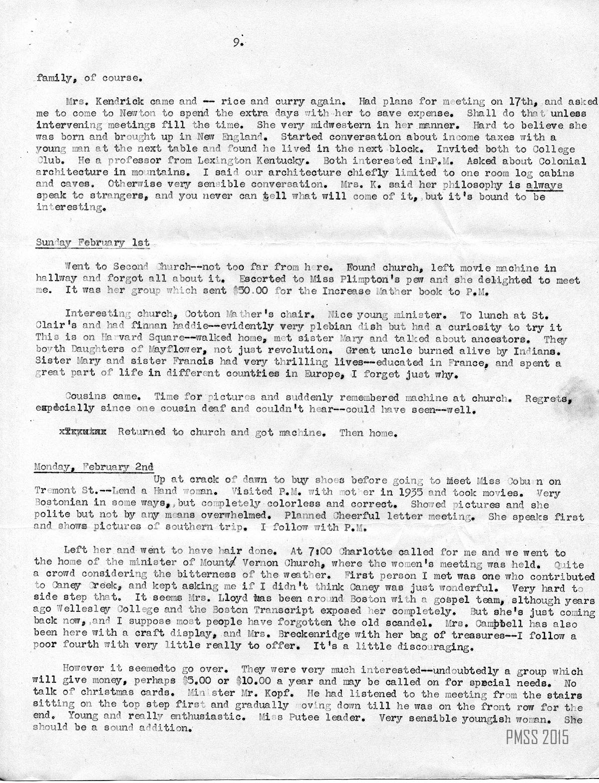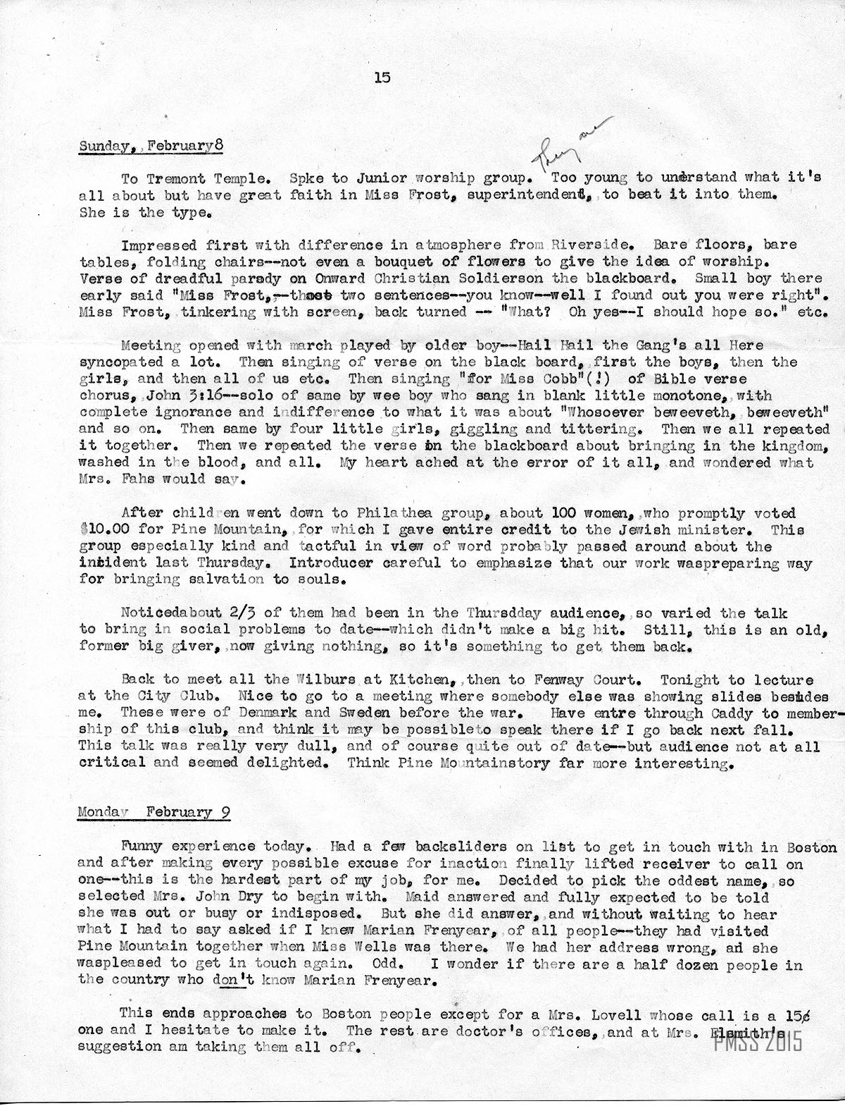 Got to Stoneham. Met at trolley end by Barbara Bicknell and her friend who is an officer of the Berea class — where I was speaking. We were late and the meeting seemed to be well on. Terribly noisy crowd of women. Thought probably this group wouldn’t be very much interested in my story, and was right, in a way. They weren’t very attentive and really didn’t understand. Believe leader was Mrs. Bradford. Anyway did not make a point of getting names as this group will only give as a group, and Barbara will probably look after them. Evidently not wealthy at all, and not socially very wide awake — would have preferred more sentimental talk with lots of little stories. Have decided to prepare a special speech of this kind for this kind of group. The trouble is you can’t tell often till you’re well on the way, what kind you’re dealing with.