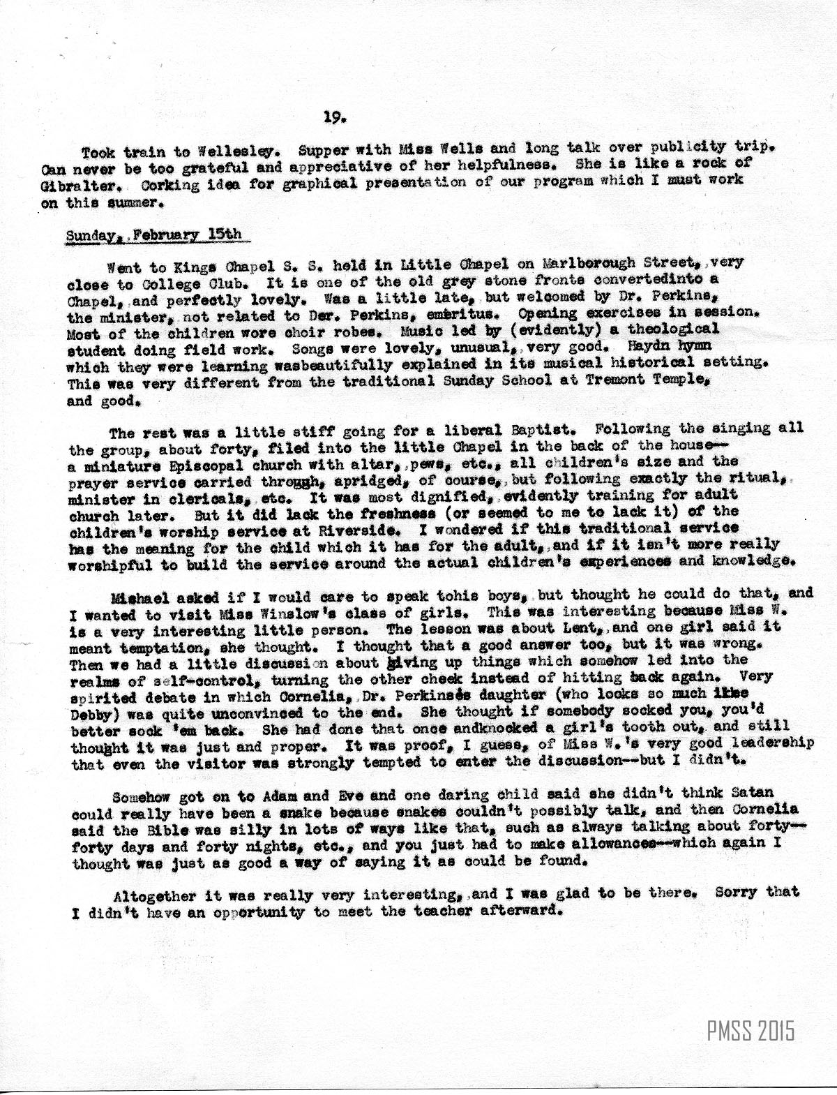 Went to Kings Chapel S[unday] S[chool] held in Little Chapel on Marlborough Street, very close to College Club. It is one of the old grey stone fronts converted into a Chapel, and perfectly lovely. Was a little late, but welcomed by Dr. Perkins, the minister, not related to Dr Perkins, emeritus. Opening exercises in session. Most of the children wore choir robes. Music led by (evidently) a theological student doing field work. Songs were lovely, unusual, very good. Haydn hymn which they were learning was beautifully explained in its musical historical setting. This was very different from the traditional Sunday School at Tremont Temple, and good.