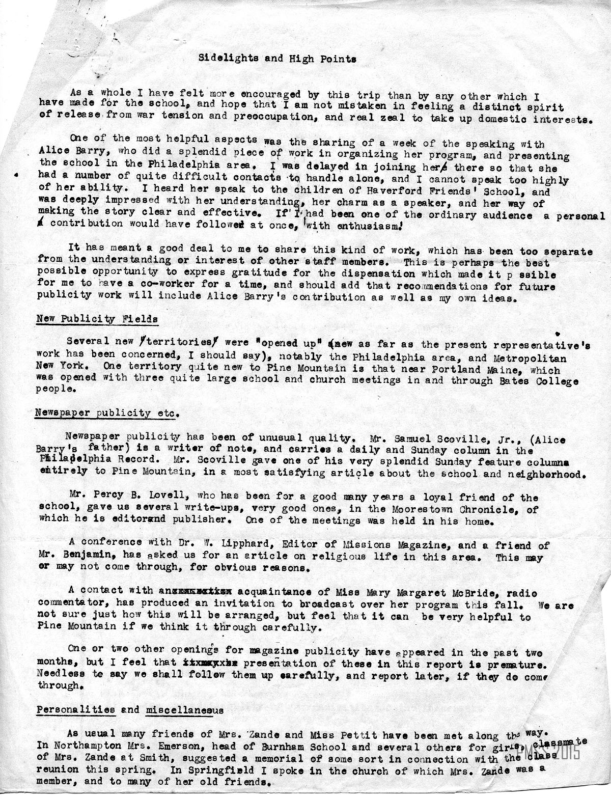 4. Five years from now, in 1951, Mrs. Zande’s graduating class at Smith College will celebrate the 50th anniversary, and Smith College will celebrate its 75th. I want to suggest that the publicity department be authorized to begin now working on some fitting memorial to be circulated among Smith College people at that time, and also to begin thinking about a possible publication of Mrs. Zande’s letters. Whether or not the school should be active in this is a question for Mrs. Zande’s relatives to decide, but inasmuch as a large part of the subject matter of her letters will have to do with Pine Mountain, it would seem to me that we are not presuming to indicate interest in such a project, and offer help, if it seems to her family a fitting thing to do.