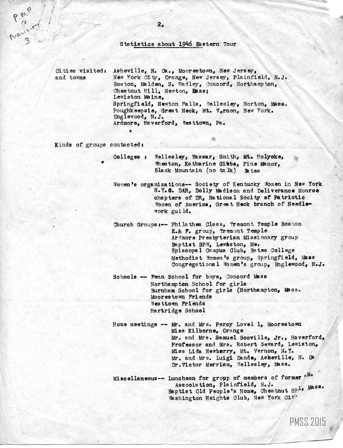 TAGS: Alice Cobb Travelogue 1946, fundraising, influenza, train travel, northeastern cities, publicity, chicken pox, pink radicals, church groups, colleges, women’s organizations, Pine Mountain Settlement School, travelogues, publicity, fundraising, students , slide shows, Asheville, NC, Luigi Zande, Caroline Zande, Berto Zande, Frony Zande, Mrs. Baird, Bainbridge [“Bunty”] Bunting, Black Mountain Colleg, Thomas Wolfe ; Allenstand, Winfield and Charlotte Cornett, Mrs. William H. Pouch, Bertha B. and Ernest Cobb, New York, NY fundraising, Boston, MA fundraising, Plainfield Association, Margaret McCutcheon, Evelyn K. Wells, Jessie Munger, chicken pox, pink radicals, transportation, Mr. and Mrs. Percy B. Lovell. Angela Melville, Sophia Lynons Fahs, Elizabeth Lyman, Society of Kentucky Women in New York, H.R.S. Benjamin, Miss Kilborne, Dr. W. Lipphard , Daughters of the American Revolution, D.A.R., York Club ; Mrs. Mansur ; Wellesley College, Mary E. Abercrombie. Miss Katherine Pettit, Mrs. Ethel de Long Zande, New Englanders ,Fenn School, Gertrude Smith, Burnham School, Miss Edith Canterbury, Burkham Schoolhouse fire, Dorothy (Olcott) Elsmith, Tremont Temple, Lorna Wearing, Bates College, Bertha Cold, Addie Cornett, College Club, Dr. and Mrs. Merriam, Pine Manor ; Paul, Elizabeth, and Jean Cressey, Mr. and Mrs. Samuel Scoville Jr., Friends School, Mrs. William A. Pouch, Mary Margaret McBride ; travel budgeting ; Zande letters, Mount Holyoke College, Smith College, church groups ; schools ; women’s organizations ; Professor and Mrs. Robert Seward, Lida Newberry, Dr. Victor Merriam, Mrs. Arthur Kendrick, Mr. and Mrs. Herbert Barry, Mr. and Mrs. Francis Collier