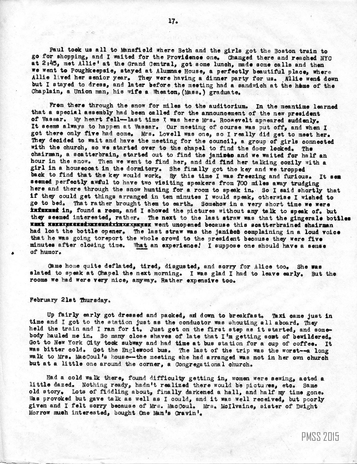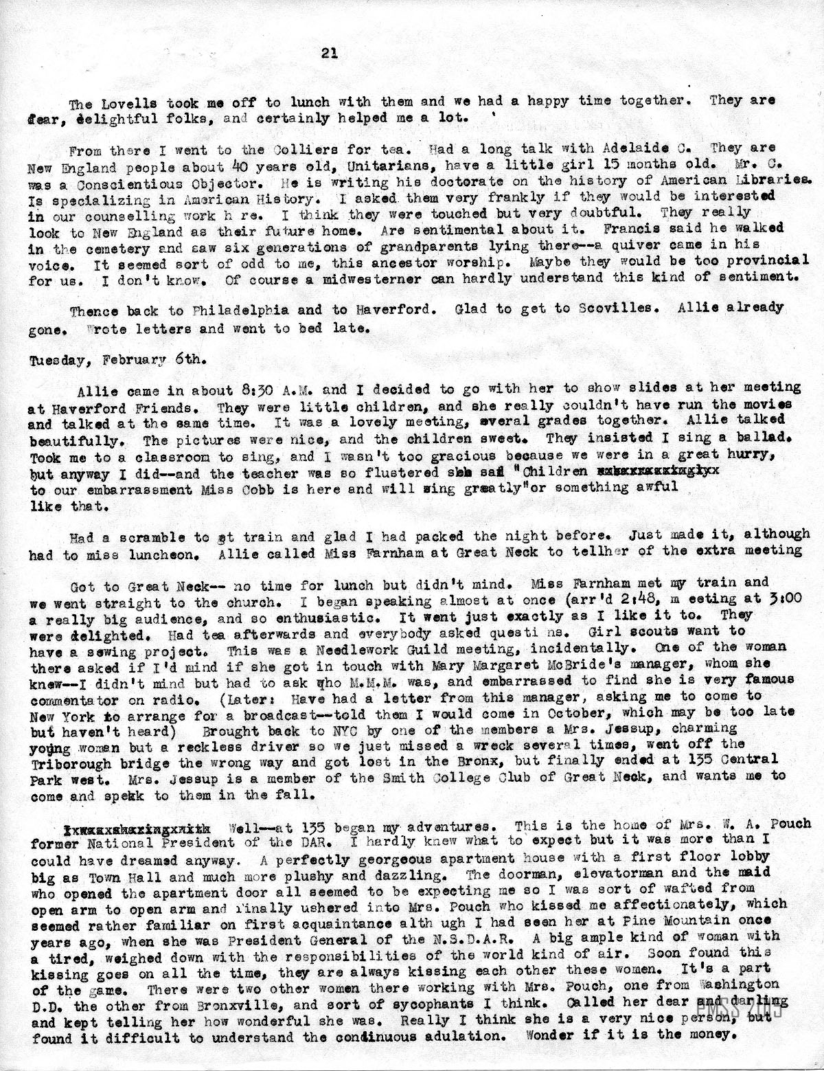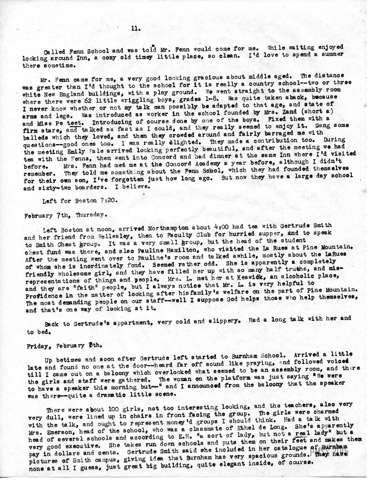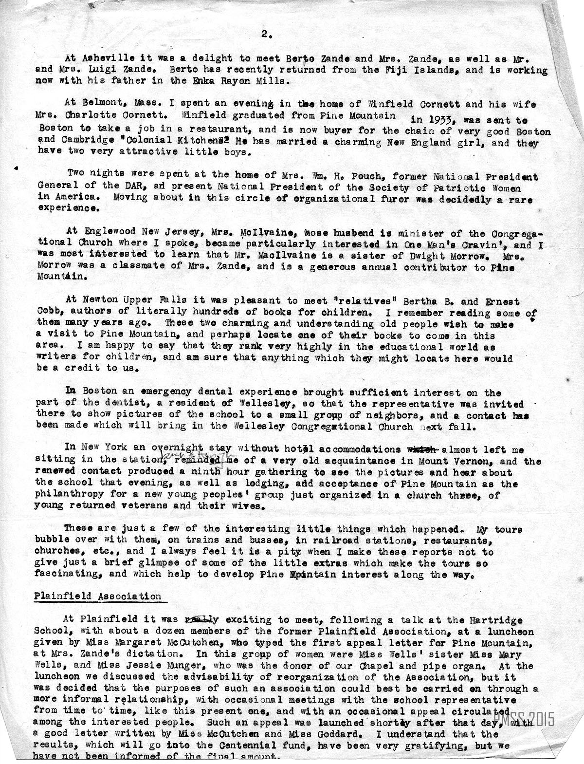 She first visited Black Mountain College [Academy] where she finds the arts programs and the students “confounding”. Then by train she traveled to Moorestown, PA, and then continued on to New York City, NY, and to Plainfield and Orange, NJ, She then was entertained by the “Boston Brahmins.” Also, in the Boston area she visited Wellesley College where former PMSS staff member, Evelyn K. Wells, was teaching. From there, she was on to S. Undley, Concord, and Poughkeepsie, NY, where Pine Mountain had friends. Her last stop was in More, PA (Westown), and she then returned by train to Pine Mountain.