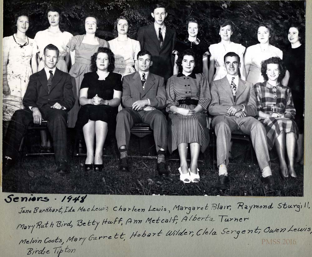 “Seniors 1948.” [Back row] Jane Burkhart, Ida Mac Lewis, Charleen Lewis, Margaret Blair, Raymond Sturgill, Mary Ruth Bird, Betty Huff, Ann Marie Metcalf, Alberta Turner. [Front row] Melvin Coots, Mary Garrett, Hobart Wilder, Clella Sergent, Owen Lewis, Birdie Tipton. [nace_II_album_100.jpg]