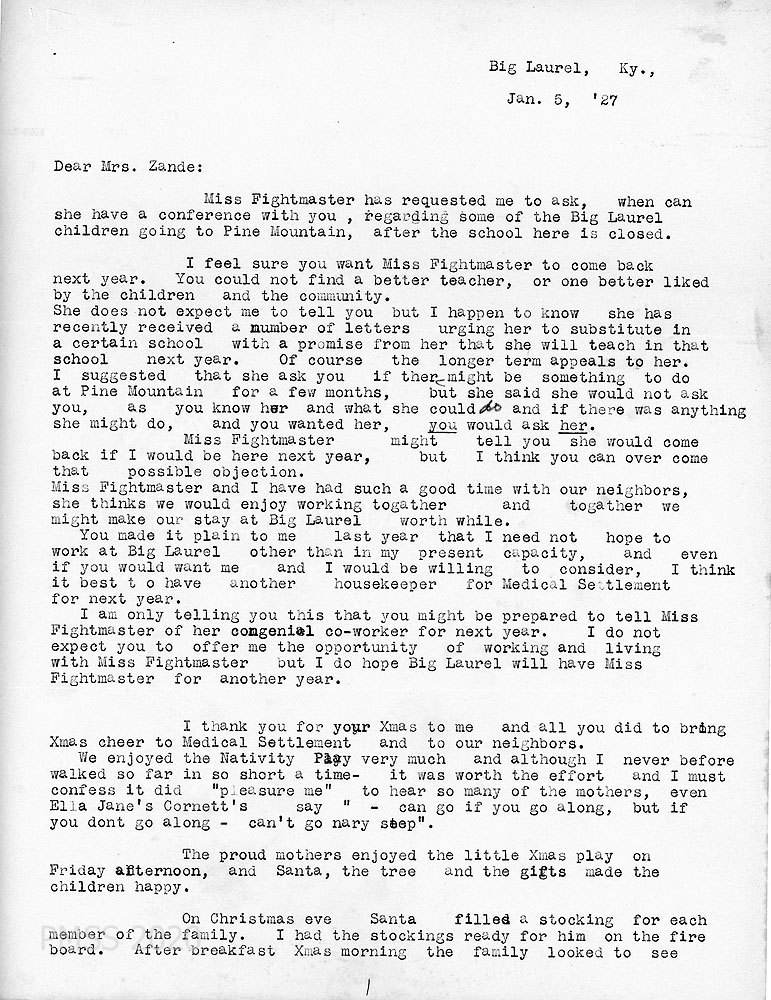 [045] – [045a] January 5, 1927. Two-page letter to Zande from Anna. [045] Miss (Pearl) Fightmaster asks to meet with Zande about some of the Big Laurel children attending PMSS; praises Fightmaster’s work as teacher who might stay at Big Laurel if Anna were staying also, but Anna “think[s] it best to have another housekeeper for Medical Settlement for next year.” Thanks Zande for the “Xmas cheer“ she brought to Big Laurel and its neighbors. Anna attended the Nativity Play with Ella Jane Cornett; [045a] made Christmas stockings for the Big Laurel family; visited Uncle Elec and Aunt Stacey; attended Xmas service given by Mr. Fields. Describes other Xmas activities and food at Big Laurel; invited Miss Carpenter and “her little folks.”  Tells Zande that “In many, many ways you know I think you are wonderful. I will be so happy to know there is no longer a fight for health. ….”