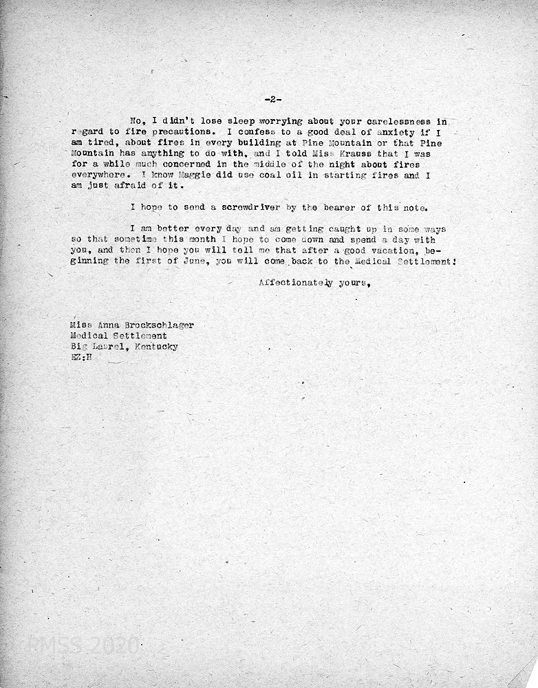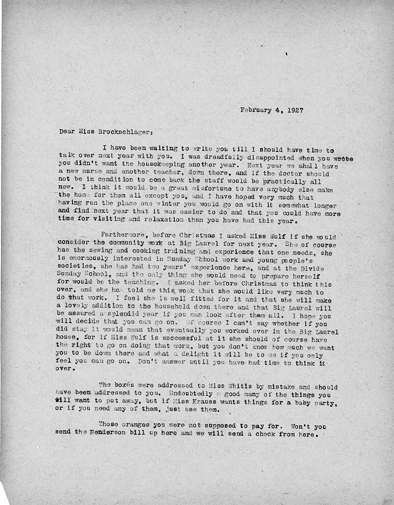 [047] – [047a] February 4, 1927. Two-page letter to Anna from EZ (Zande). [047] who regrets that Anna won’t work as Big Laurel housekeeper next year and urges her to stay; a new nurse and another teacher will be there. Miss [Anna] Wulf has accepted the community work position at Big Laurel for 1928; describes Wulf’s work experience. [047a] “I confess to a good deal of anxiety, if I am tired, about fires in every building at Pine Mountain …”
