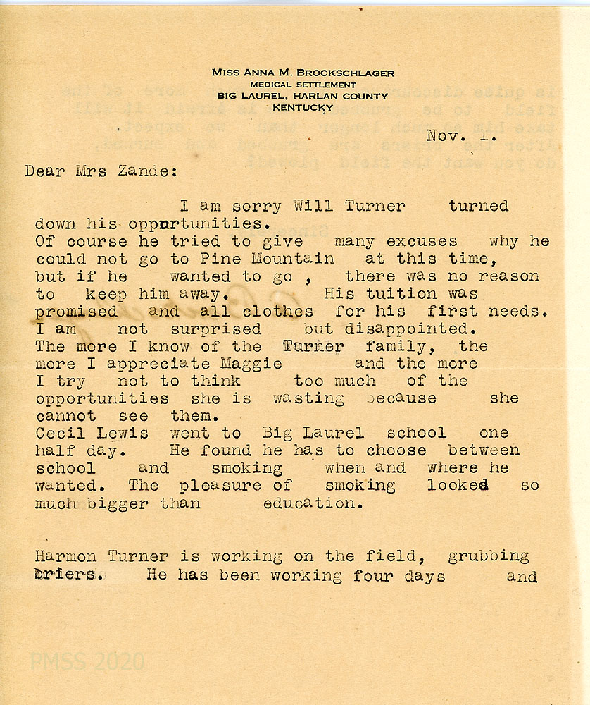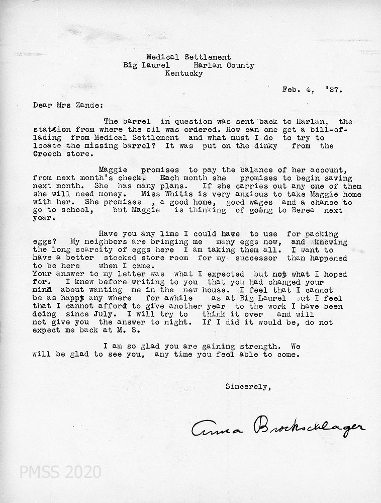 [048] February 4, 1927. To Zande from Anna. Miss Whitis offered to take Maggie [Turner] home [in Pleasantville, NY] with her but Maggie is thinking of attending Berea College next year. Asks for lime to use for packing eggs. “I feel that I cannot be as happy anywhere for awhile as a Big Laurel but I feel that I cannot afford to give another year to the work I have been doing since July.”
