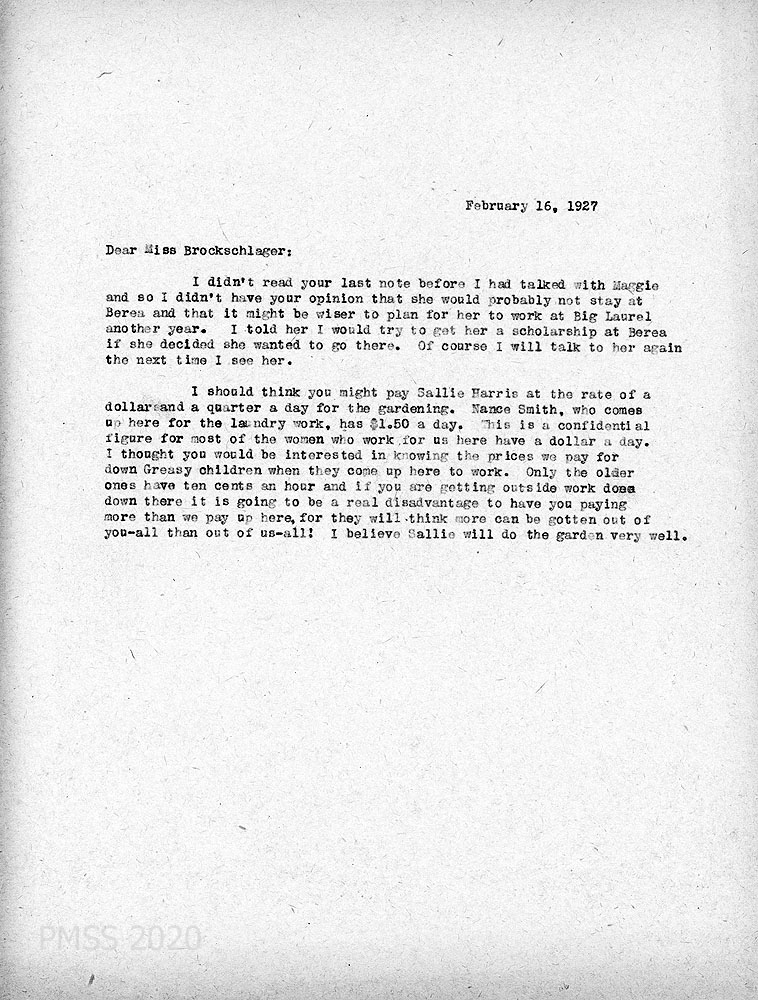 [050] February 16, 1927. To Anna from [unsigned, apparently Zande], who had told Maggie she would try to get her a scholarship if she goes to Berea. Suggests paying Sallie (sic) Harris $1.25 a day for gardening; Nance Smith is paid $1.50 for laundry; “down Greasy children” (the older ones) get 10 cents an hour.
