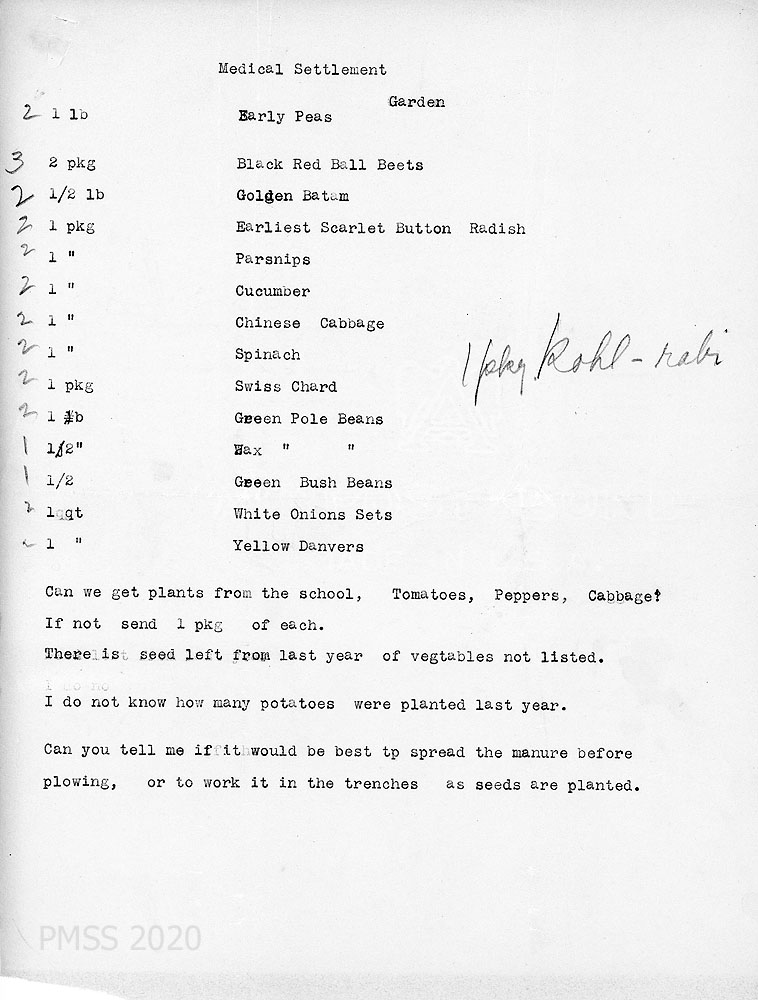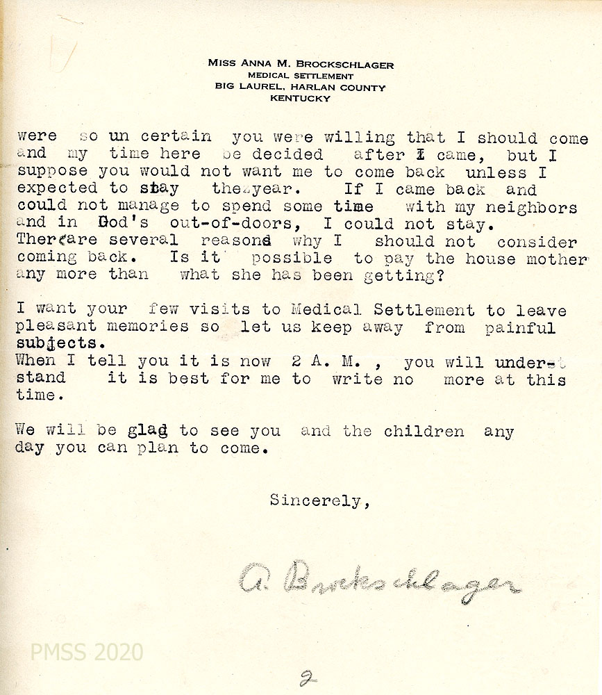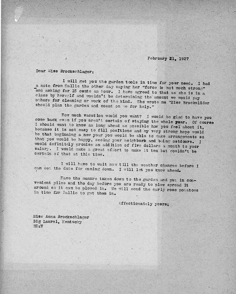 [051] – [051b] February 17, 1927. Three-page letter to Zande from Anna [051] on letterhead for “Anna M. Brockschlager, Medical Settlement Big Laurel, Harlan County, Kentucky.” Describes Sally’s enthusiasm for working on the Settlement garden. Asks about vacation if she comes back. [051a] Give reasons why she “should not consider coming back.” [051b] List of vegetable seed packets that will be needed for the Medical Settlement garden; asks for advice.