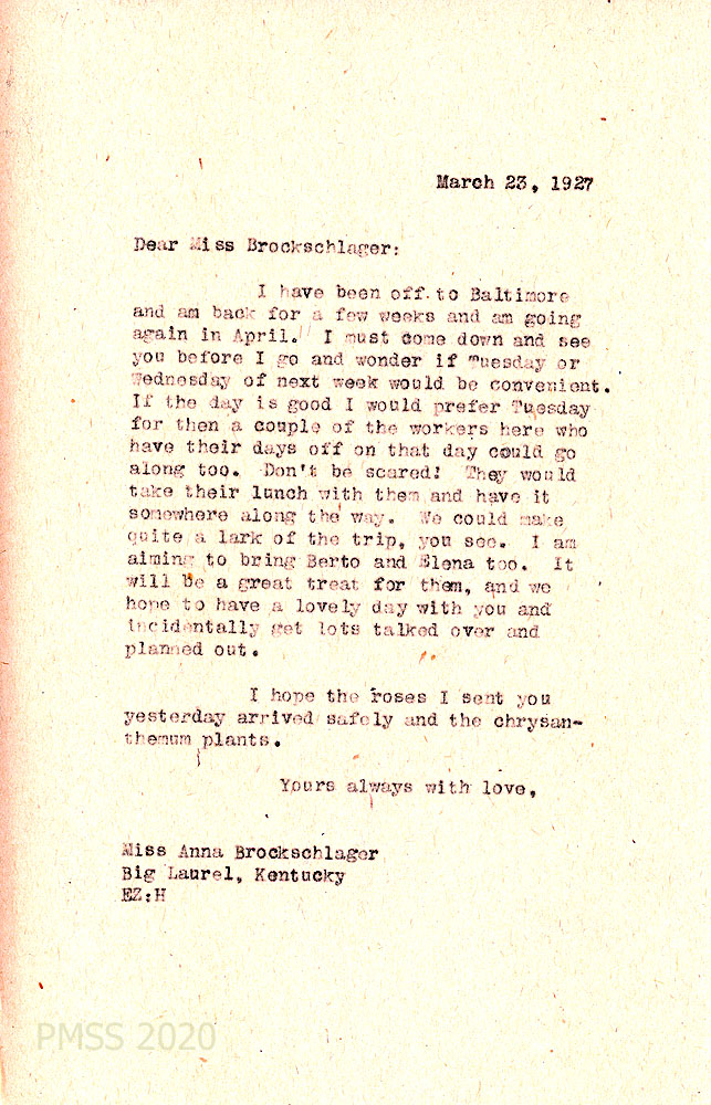 [054] March 23, 1927. To Anna from EZ (Zande), who is traveling to Baltimore for a few weeks; arranges to visit Big Laurel along with some of the workers and Berto and Elena.