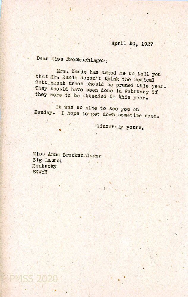 [058] April 20, 1927. To Anna from EKW (Wells), relaying a message from Mr. Zande about pruning the trees.