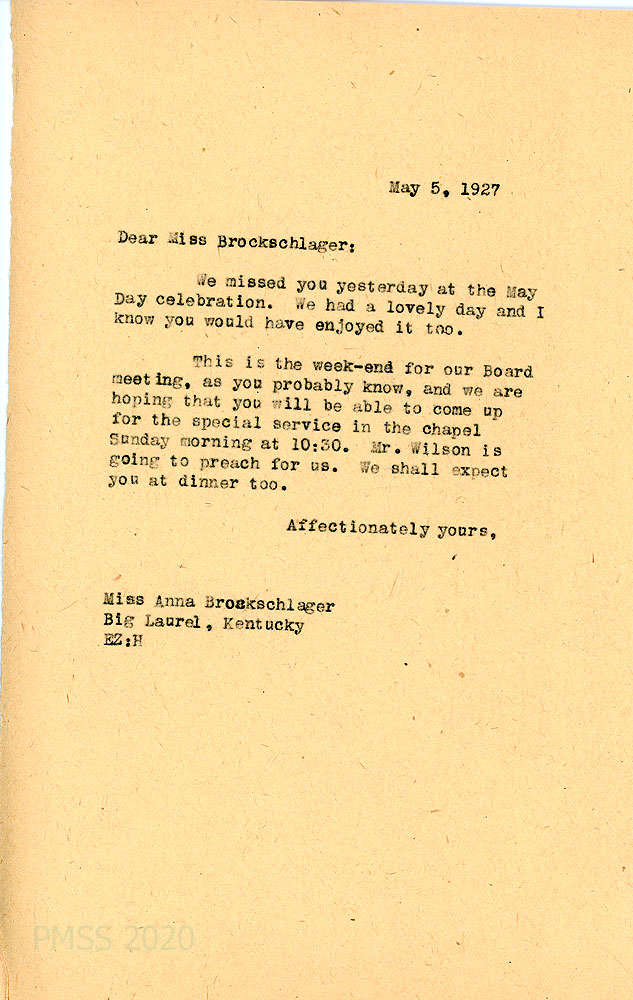 [060] May 5, 1927. To Anna from EZ (Zande), who invites her to the special Chapel service and dinner during the Board weekend; Mr. Wilson will preach.