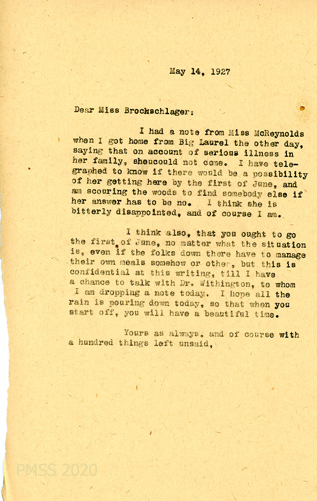 [061] May 14, 1927. To Anna from [unsigned], [061] reporting that Miss [Nina] McReynolds may not come to PMSS; tells Anna she “ought to go the first of June.”