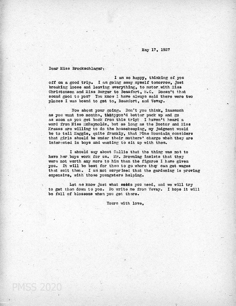 [062] May 17, 1927. To Anna from [unsigned, likely Zande], who is leaving tomorrow with Miss [Abby] Christensen and Miss Burger to Beaufort, SC. Advises on what to tell the Doctor, Miss Krauss about leaving; Maggie about hosting a boy (Weston); and about not hiring Sallie’s boys for gardening.