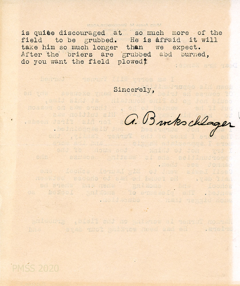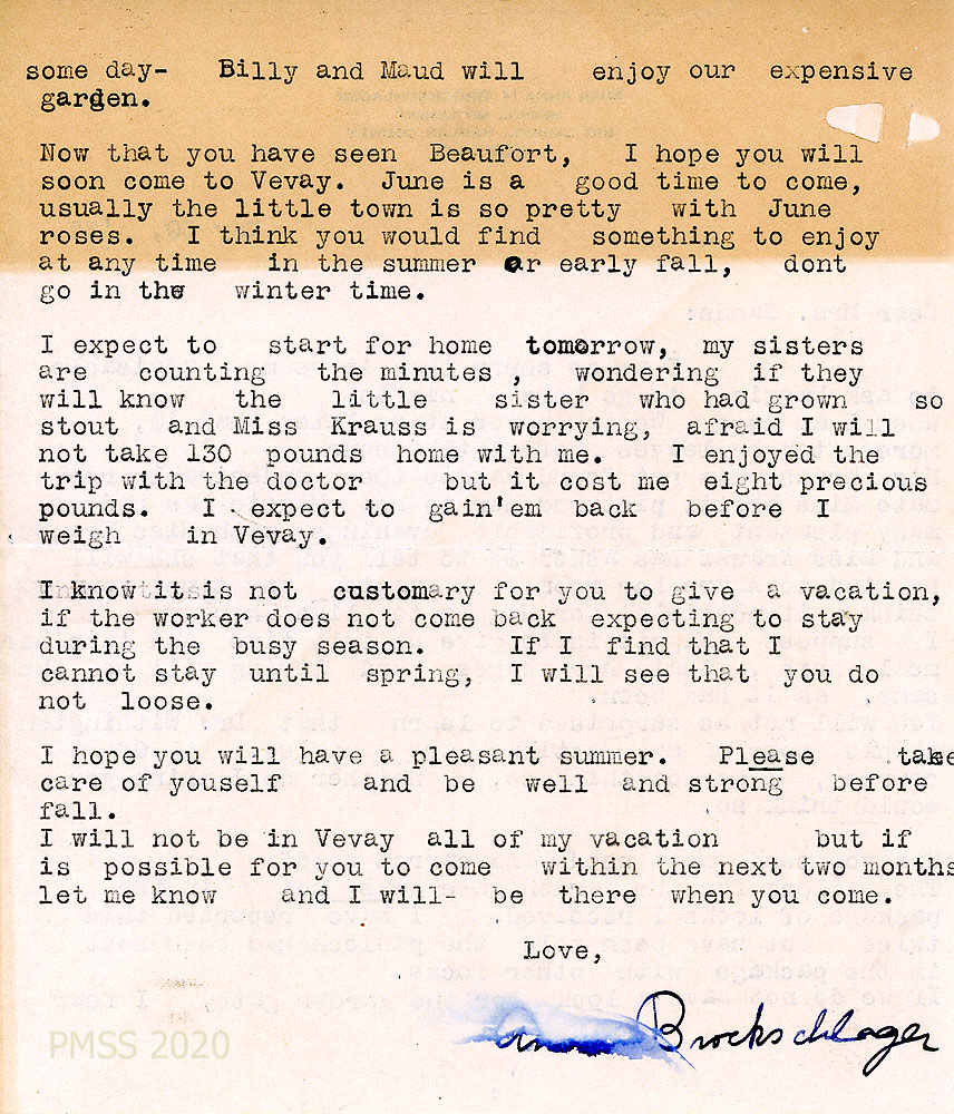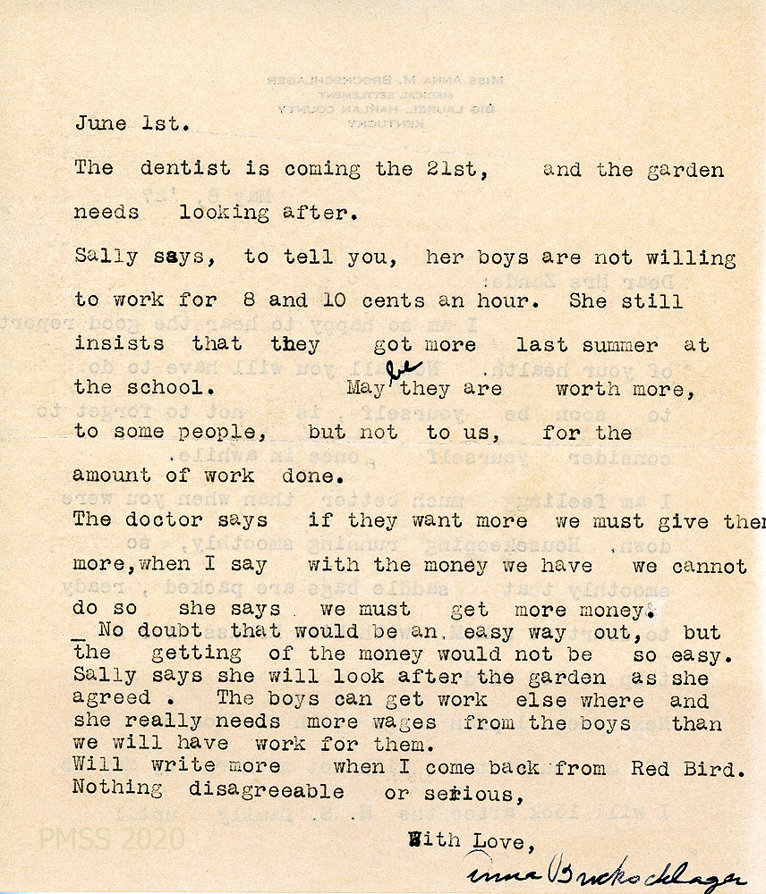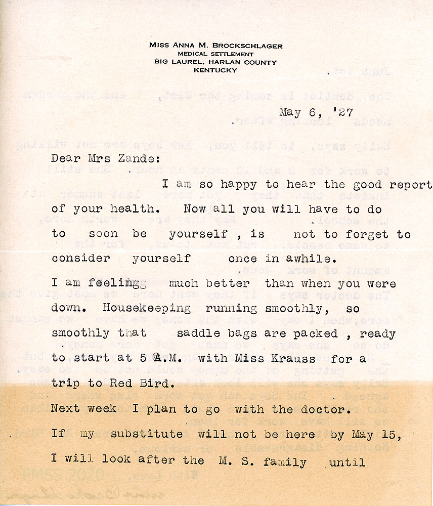 [063] May 6, 1927. To Zande from Anna on “Miss Anna M. Brockschlager…” letterhead, [063] who has packed her saddle bags for a trip to Red Bird with Miss Krauss. If her substitute doesn’t arrive by May 15, “I will look after the M.S. [Medical Settlement] family until [063a] June 1st.” Sally’s boys want to be paid more for gardening.
