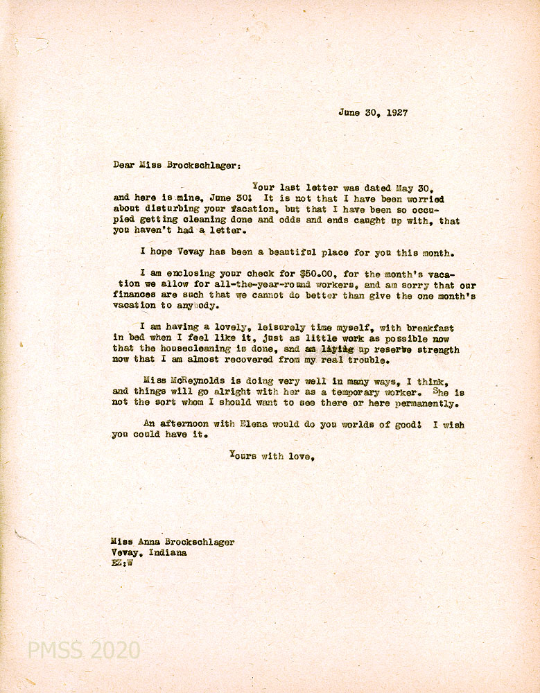 [065] June 30, 1927. To Anna in Vevay, IN, from EZ (Zande). Encloses $50 check for Anna’s month’s vacation that is allowed for all year-round workers. “… I am almost recovered from my real trouble.” Miss McReynolds is “doing very well in many ways…as a temporary worker.”