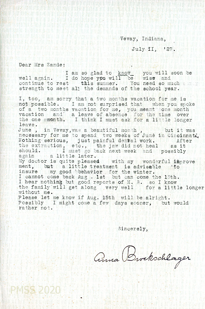[Note: All letters from PMSS administrators are carbon copies, typewritten, unsigned, and meant for the Office files. The initials at the bottom left of most PMSS letters indicate the writer (along with the initials of the secretary). For example “EZ” are the initials for Ethel de Long Zande, “KP” refers to Katherine Pettit, and “EKW” to Evelyn K. Wells. The letters from Anna Brockschlager are typewritten originals except where noted. The following list of contents is in chronological order and not necessarily in order of the image numbers. Transcriptions may be slightly edited.]