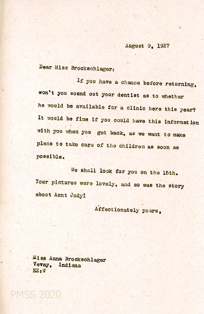 [069] August 9, 1927. To Anna from EZ (Zande), who asks if Anna’s dentist can hold a clinic at PMSS this year.