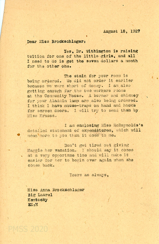 [070] August 18, 1927. To Anna at Big Laurel from EZ (Zande), who, along with Dr. Withington is “raising tuition” for two little girls. Zande is getting the supplies that Anna requested; encloses Miss McReynolds’ statement of expenditures.