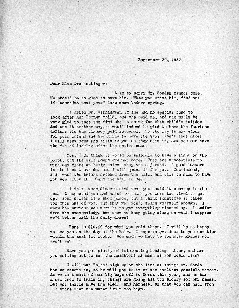 [071] September 20, 1927. To Anna from [unsigned, likely Zande], who regrets that Mr. Soudah cannot visit; refers to funding the “Turner child” and others; lantern, briars; sent money to pay Abner; sorry to see Miss Krauss leave; [Luigi] Zande will attend to the sled and harness.