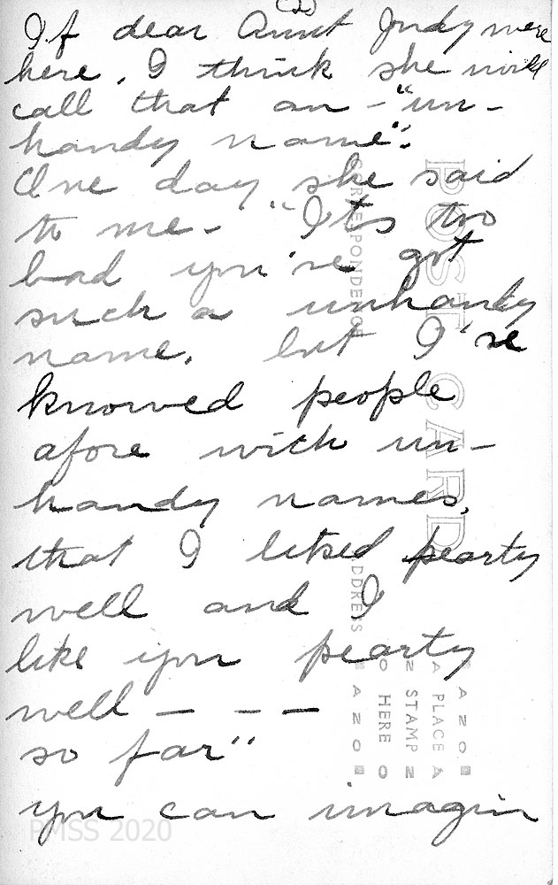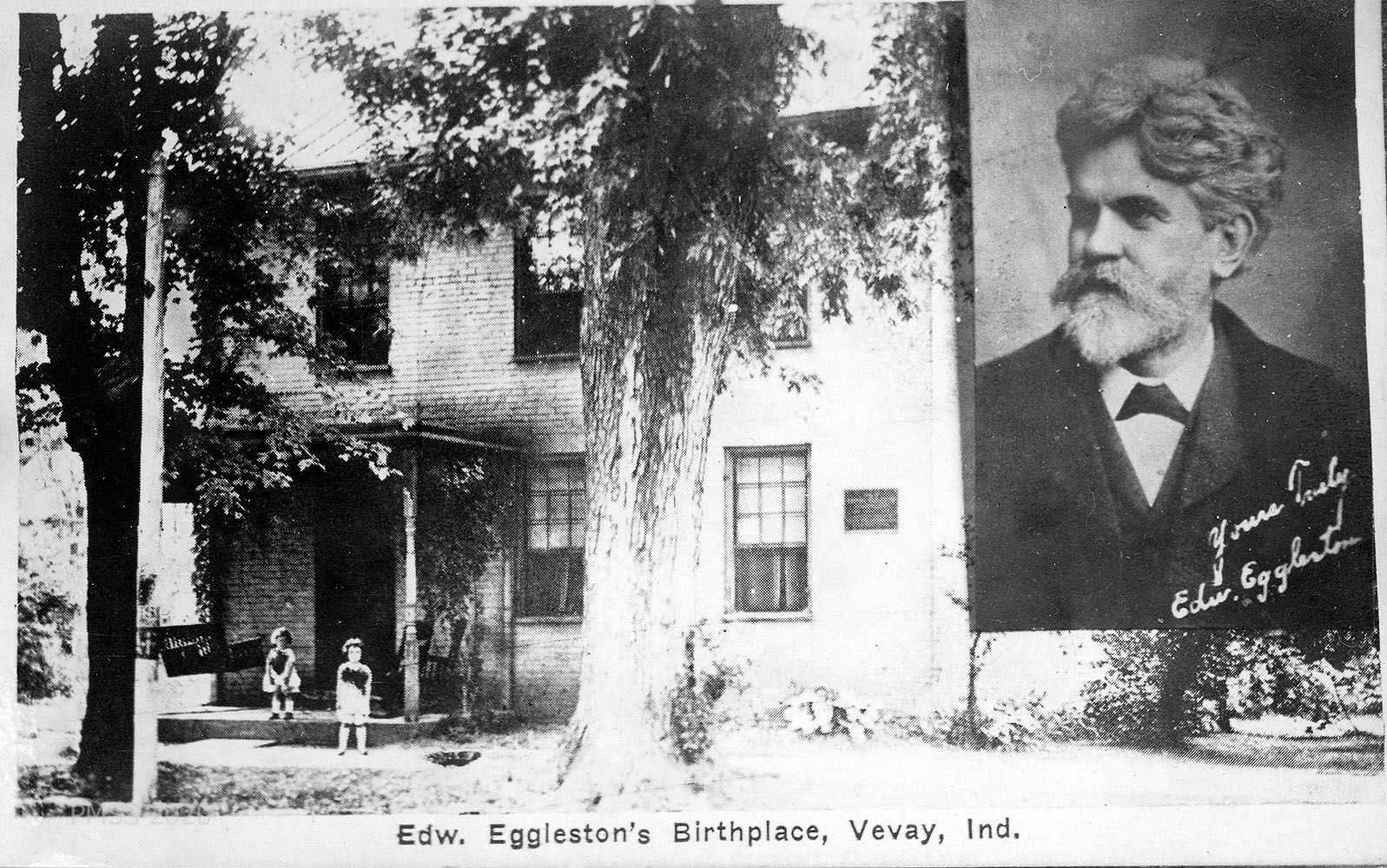 [072a] – [072cc] N.D. Three handwritten postcards and three photos to Zande from “A.M.B.” [Anna], [072a] who spent a week at Riverair Camp near Vevay on the Ohio River. [072aa] Image of “Scene Near Vevay, Ind.[072b] Quotes Aunt Judy about “unhandy names.” [072bb] Image of “Edw Eggleston’s Birthplace, Vevay, Ind.” [072c] Will return on the 15th. [072cc] Image of “Scene Near Vevay, Ind.