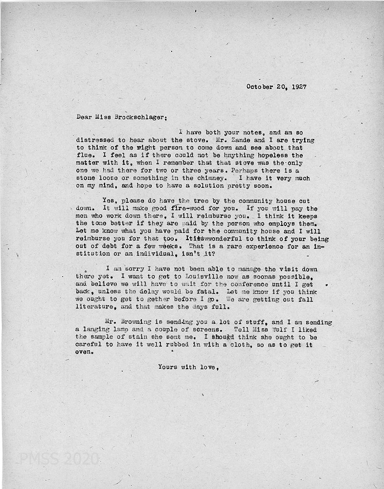 [073] October 20, 1927. To Anna from [unsigned], writing about the malfunctioning stove; cutting down the tree by the community house; Mr. Browning and she are sending supplies.