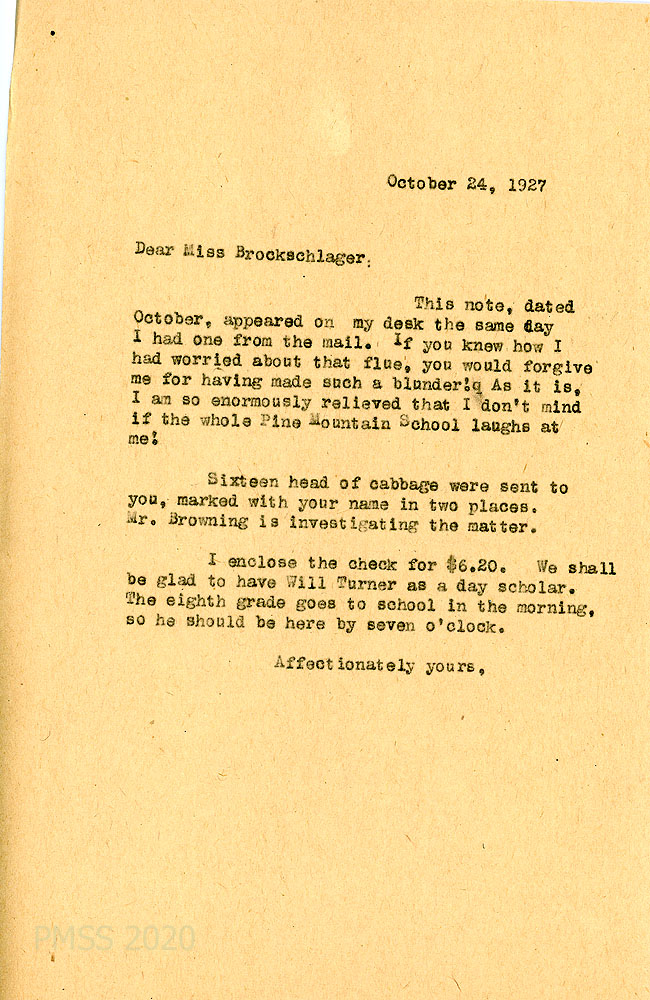 [074] October 24, 1927. To Anna from [unsigned, likely Zande]. Mr. Browning is investigating the 16 cabbages that were sent to Anna; Encloses check; mentions Will Turner returning to eighth grade as a day scholar.
