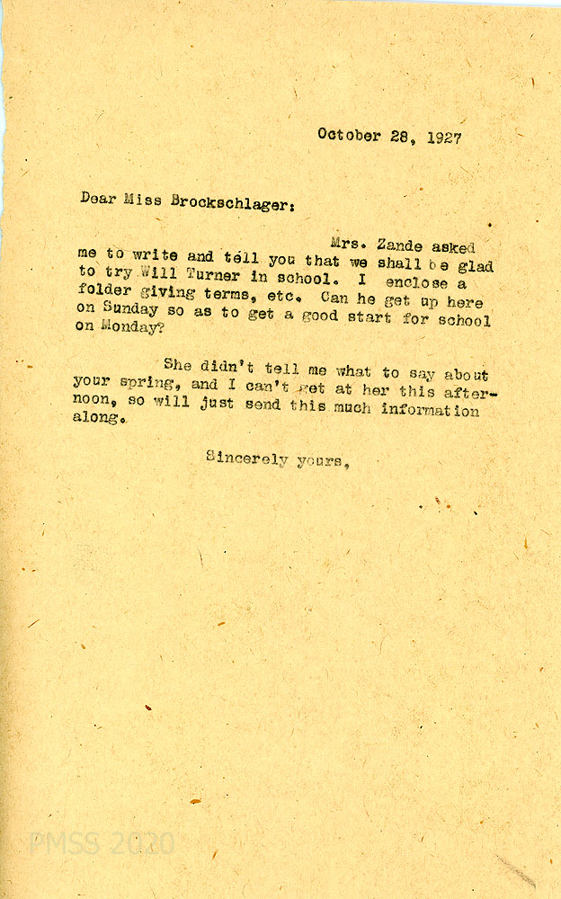 [076] October 28, 1927. To Anna from [unsigned], relaying Zande’s message that “we shall be glad to try Will Turner in school.”