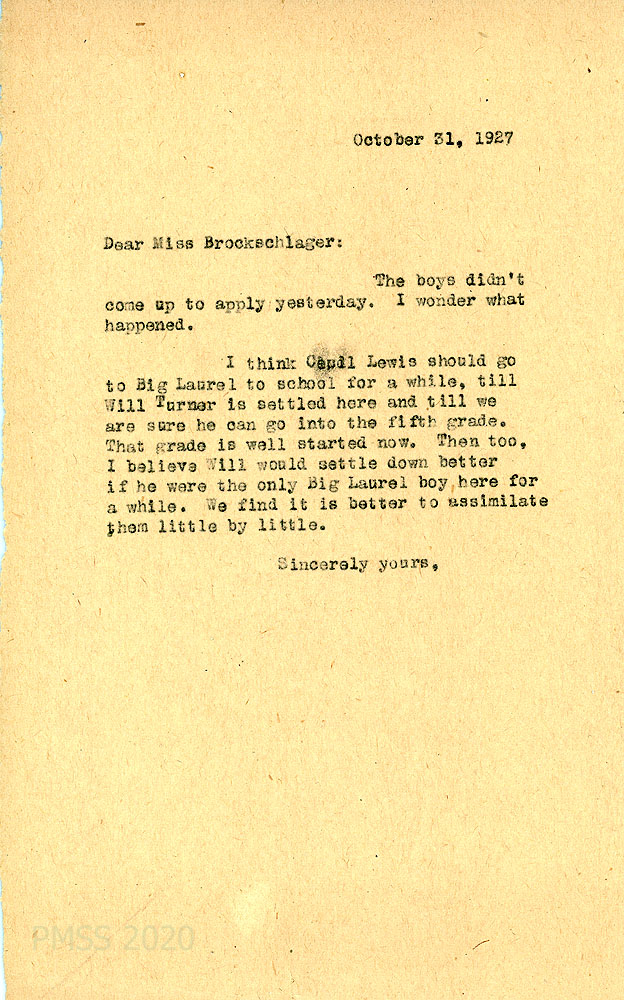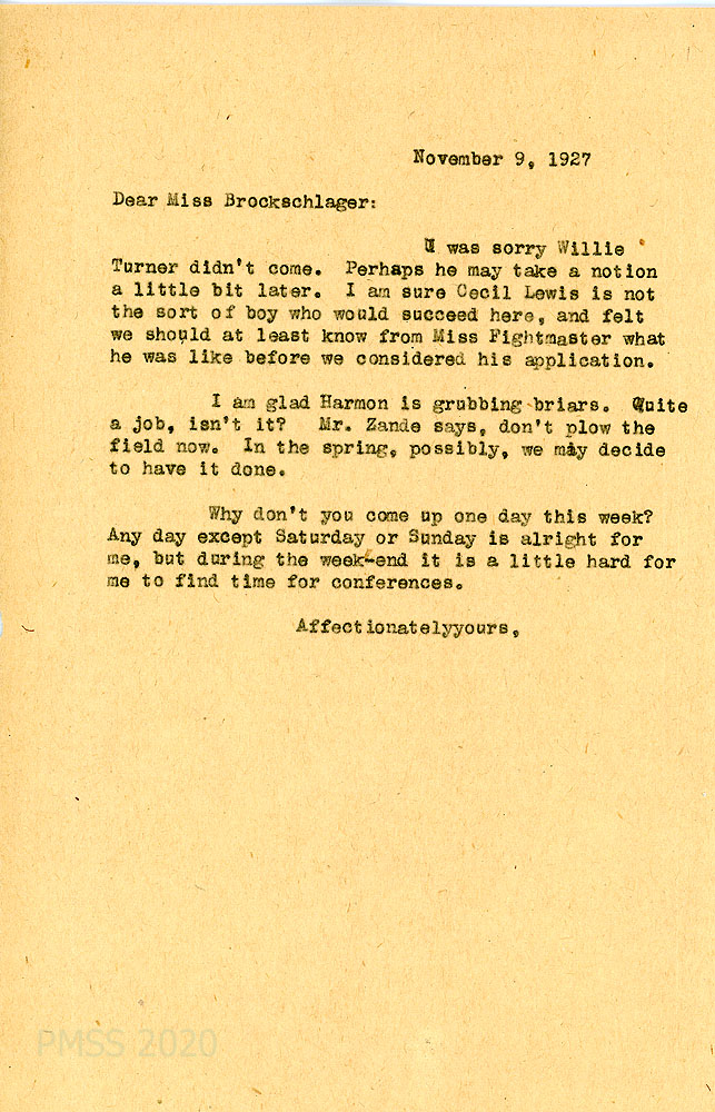 [077] October 31, 1927. To Anna from [unsigned], wondering why “the boys didn’t come up to apply yesterday.” Suggests what to do about Cecil Lewis and Will Turner. “We find it is better to assimilate them little by little.”