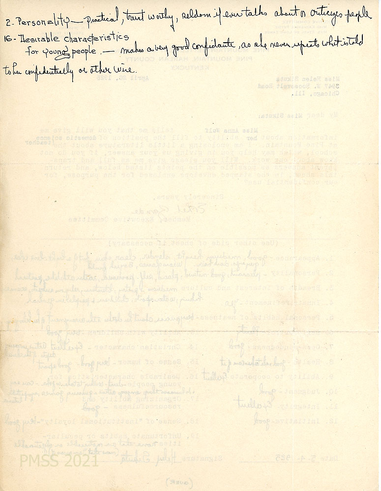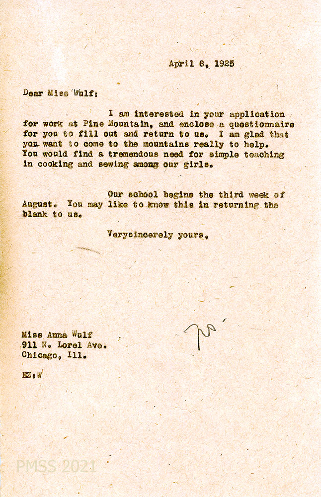 [012] June 9, 1925. To Wulf from [unsigned, apparently Zande], who asks Wulf “to come to Pine Mountain next year as teacher of cooking and sewing from August 24th to May 15th, at $60.00 a month and living.” Describes how little some of the girls know about sewing, cooking, or housework, so her teaching “should be intensely practical.” Asks Wulf to arrive early to become acquainted with the country and the girls. Tells her the type of clothing to bring; Encloses traveling directions.
