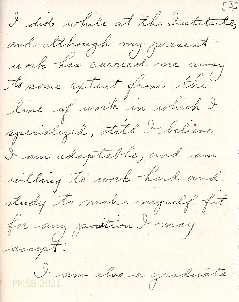[004a through 004d] March 29, 1925. To Zande from Wulf in Chicago, IL, relating her interest in the vacancy at PMSS, as reported to her by Miss Grace Hood of the Lewis Institute of Chicago. She graduated from Lewis Institute in 1918 with a B.S. in Domestic Economy. “Since graduation, I served as the chemist for a flour milling company for four years, and then as draftsman and supervisor in a large concern where I am at present employed.” No teaching experience except practice teaching at Lewis Institute. Also, graduate of the Moody Bible Institute of Chicago, and would like “to do some religious work along with the regular work. … I am interested, not so much in the salary, but in the possible benefit I might be to the people with whom I work.”