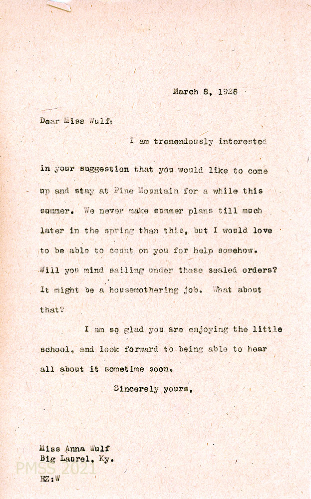 [025] March 8, 1928. To Wulf at Big Laurel, KY, from EZ (Zande), who is interested in Wulf’s suggestion to stay at PMSS this summer, suggesting a housemothering job. “I am so glad you are enjoying the little school….”