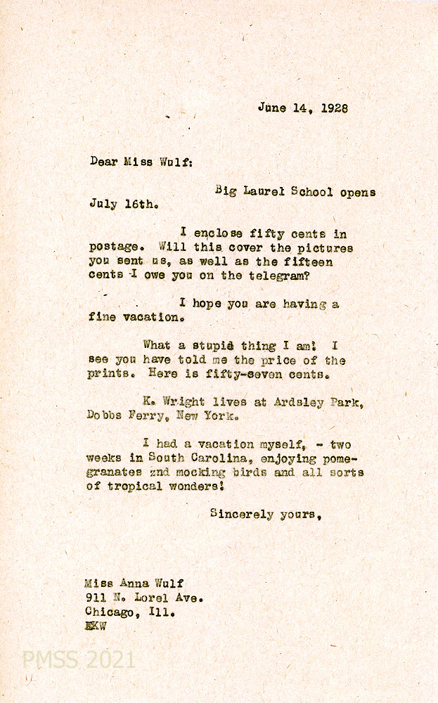 [027] June 14, 1928. To Wulf in Chicago from EKW (Wells), reporting when Big Laurel School opens. Provides the address for “K. Wright,” at Dobbs Ferry, NY. Wells mentions her vacation in South Carolina.
