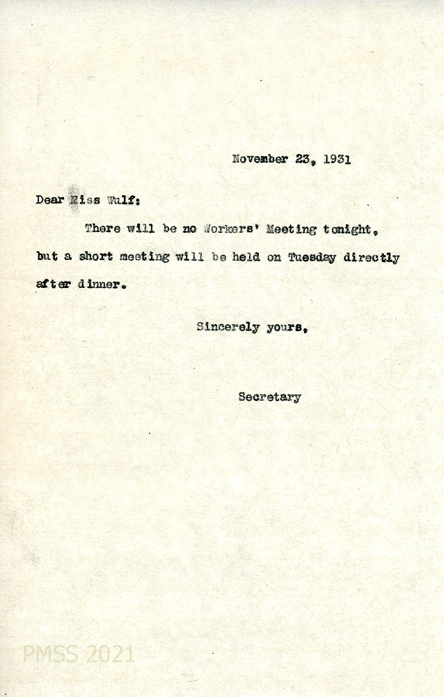 [Note: Letters from PMSS staff in the PMSS Collections are carbon copies, typewritten, unsigned, and meant for the Office files. The original signed copies were sent to the correspondents. The initials at the bottom left of many PMSS letters indicate the writer (along with the initials of the secretary). For example, “EZ” are the initials for Ethel de Long Zande, “KP” refers to Katherine Pettit, and “EKW” to Evelyn K. Wells, “AM” to Angela Melville, and “GAM” to Glyn A. Morris. Letters from Anna Wulf are handwritten unless indicated otherwise. The following list of contents is in chronological order and not necessarily in the order of the image numbers.]