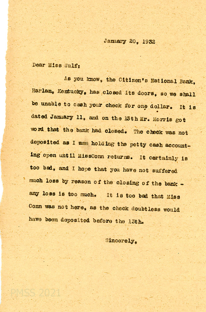 [037] January 20, 1932. To Wulf from [unsigned]. Citizen’s National Bank in Harlan, KY, has closed and her check was not deposited.