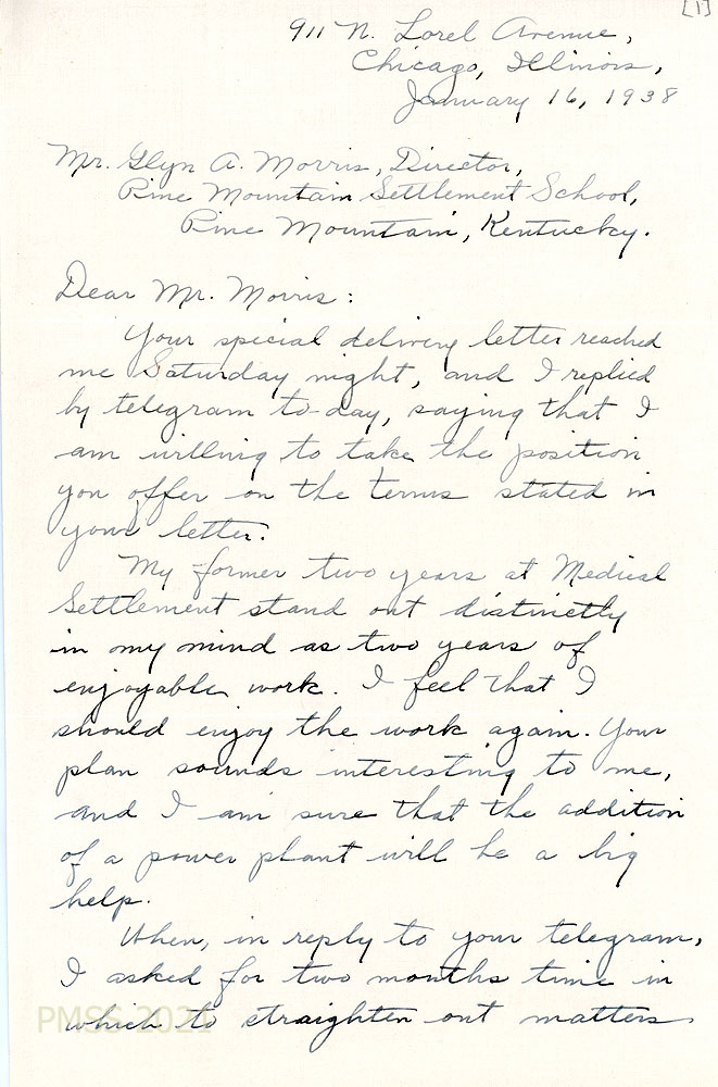 [042] January 16, 1938. To Morris from Pishzak, accepting the position. “My former two years at Medical Settlement stand out distinctly in my mind as two years of enjoyable work.” PAGE 2 IS MISSING.