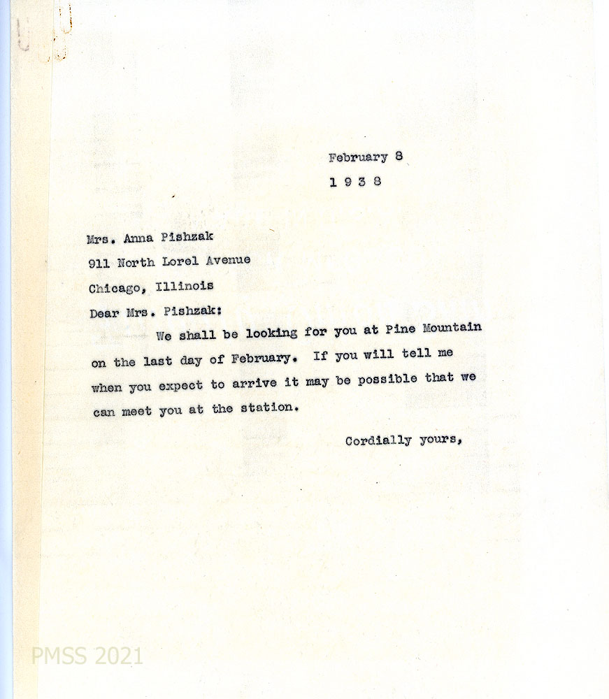 [043], [043a] January 20, 1938. Two-page letter to Pishzak in Chicago from [unsigned, likely Morris], who is glad she accepted the position. Salary is $50 a month with $10 a month maintenance. “The entire Settlement will be under your care.…”; garden; clubs and classes; community group program; vacation allowance; insurance plan for workers; retirement income policy.