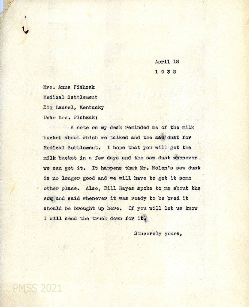 [047] March 21, 1938. To Pishzak at the Medical Settlement, Big Laurel, KY, from Morris, who will arrange for Mrs. Ollinger to relieve her once a week; advises ordering dairy feed from H.T. Hackney and Company; will see Nancy Boggs about the cow.