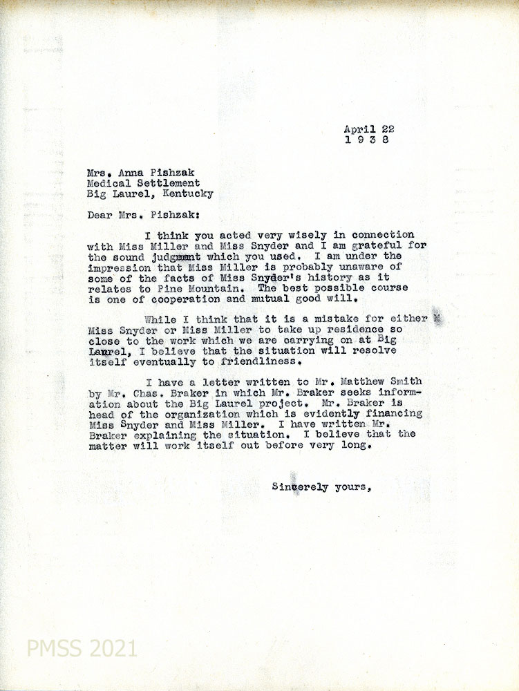[051] April 22, 1938. To Pishzak from Morris, who discourages her to include Miss Snyder or Miss Miller in work at Big Laurel, writing “I believe that the situation will resolve itself eventually to friendliness.” Morris has written to Mr. Braker, who heads the organization that finances Snyder and Miller.