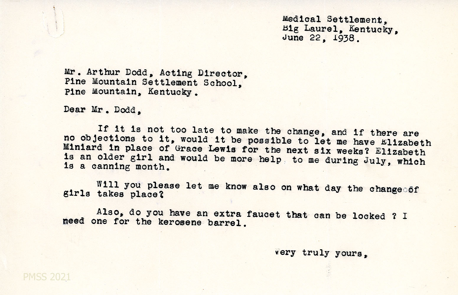 [053] June 22, 1938. To Arthur Dodd, PMSS Acting Director, from [unsigned]. Asked to replace Grace Lewis with Elizabeth Miniard for help with canning.