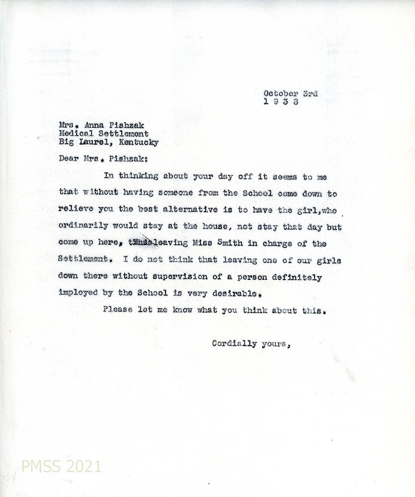 [059] October 3, 1938. To Pishzak at Medical Settlement, Big Laurel, from [unsigned], who advises that Pishzak have an employer in charge of the Settlement in her absence, such as Miss Smith.