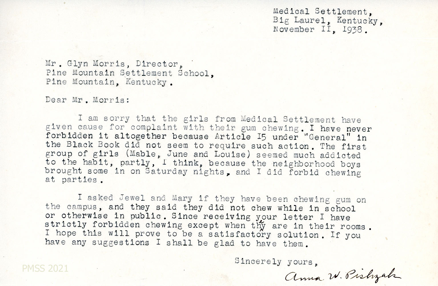[062] November 11, 1938. Typewritten letter to Morris from Pishzak, about allowing gum-chewing, per Black Book, article 15, except at parties. She will now forbid it except in their rooms.