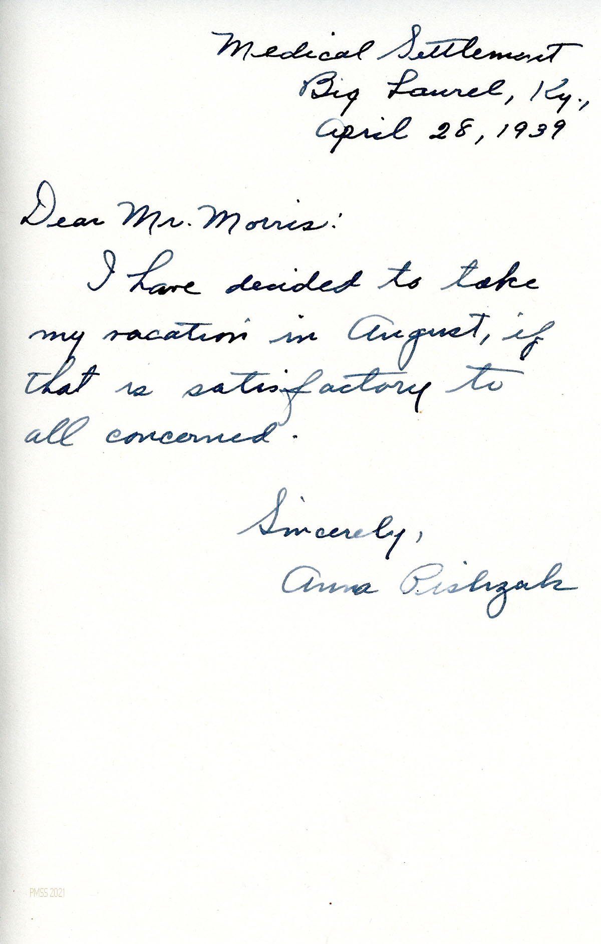 [027] February 5, 1941. “MEMORANDUM OF CONVERSATION WITH MRS. PISHZAK….We talked about the matter of her finding some group to support her there, inasmuch as the School does not propose to spend any more money at the present at Medical Settlement.” Pishzak had approached Miss Emily Storer for support.